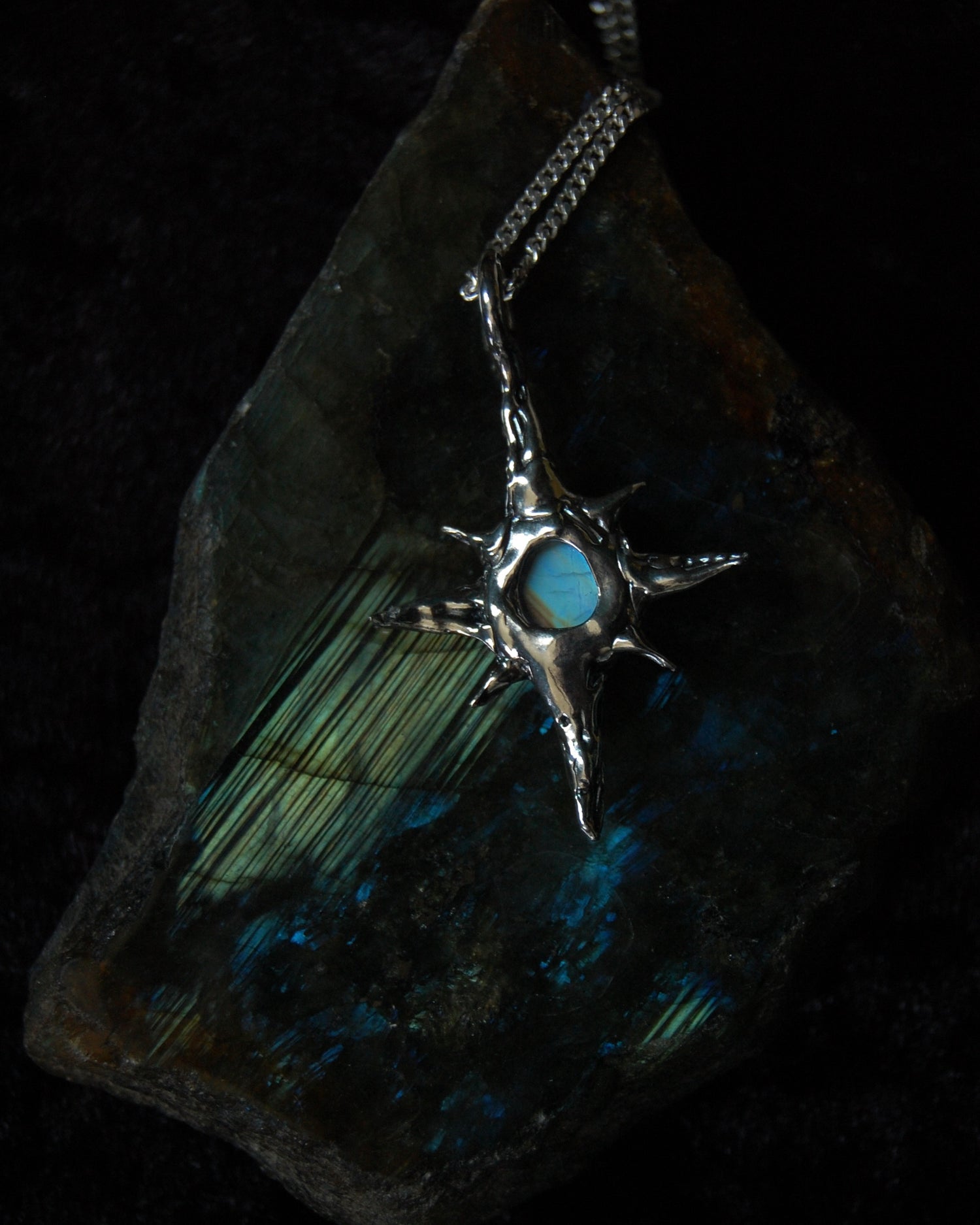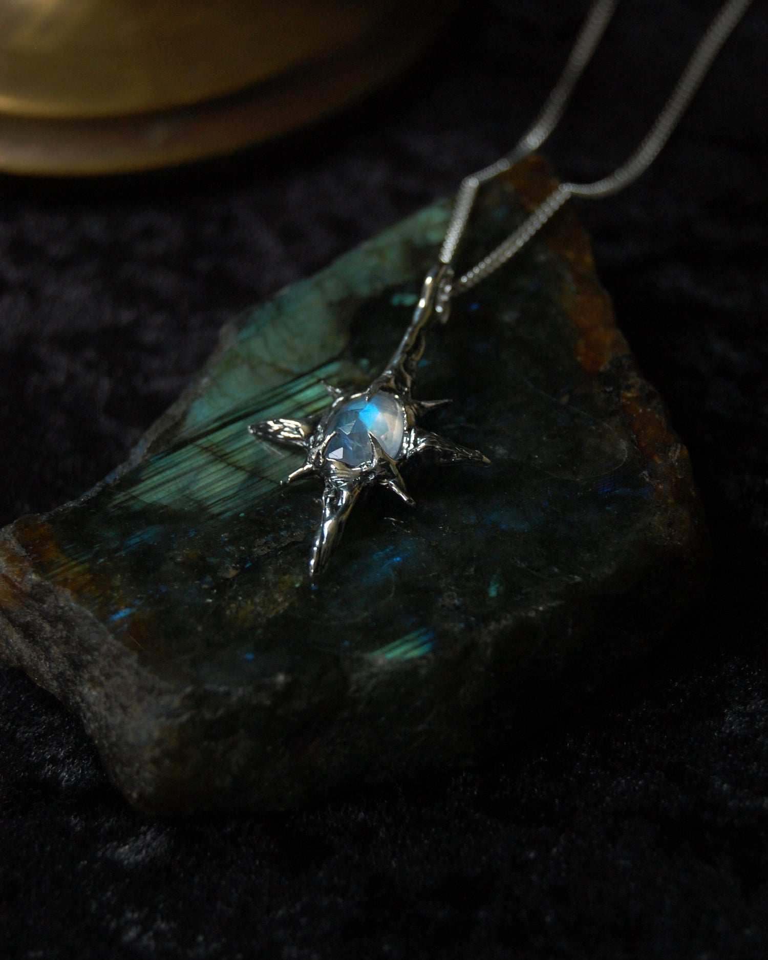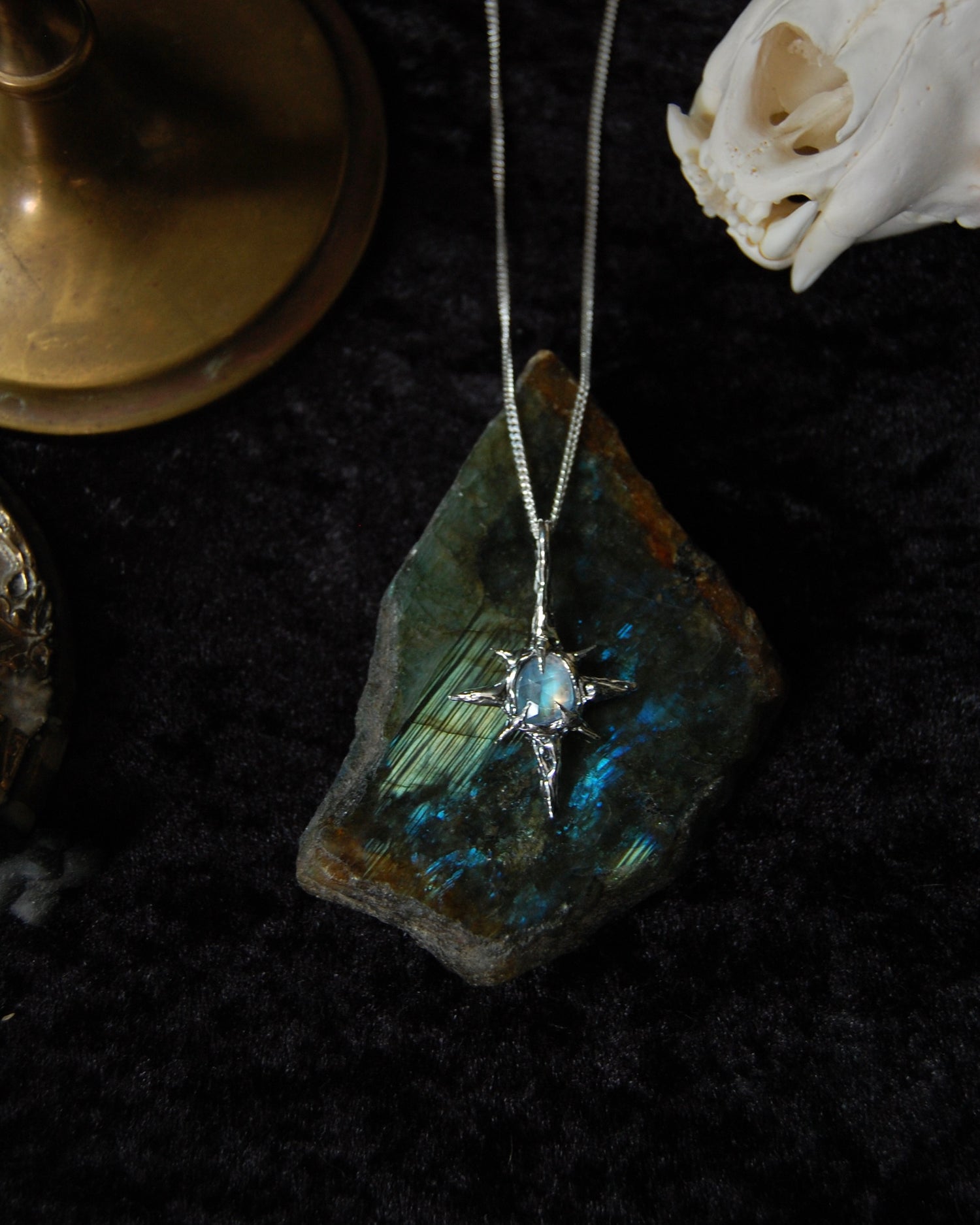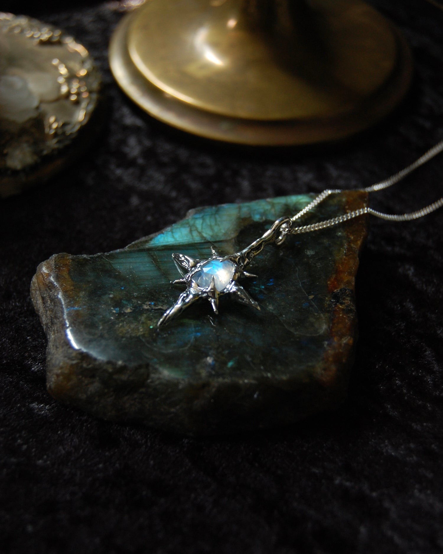 Radiate light and mystique with this enchanting starbeam amulet. Known for its luminous glow and ethereal charm, moonstone symbolizes intuition, protection, and inner clarity. Silver formed into a celestial star, this amulet is a timeless accessory to inspire and empower your journey. Whether worn daily or reserved for special moments, it’s a stunning reminder to follow your light.