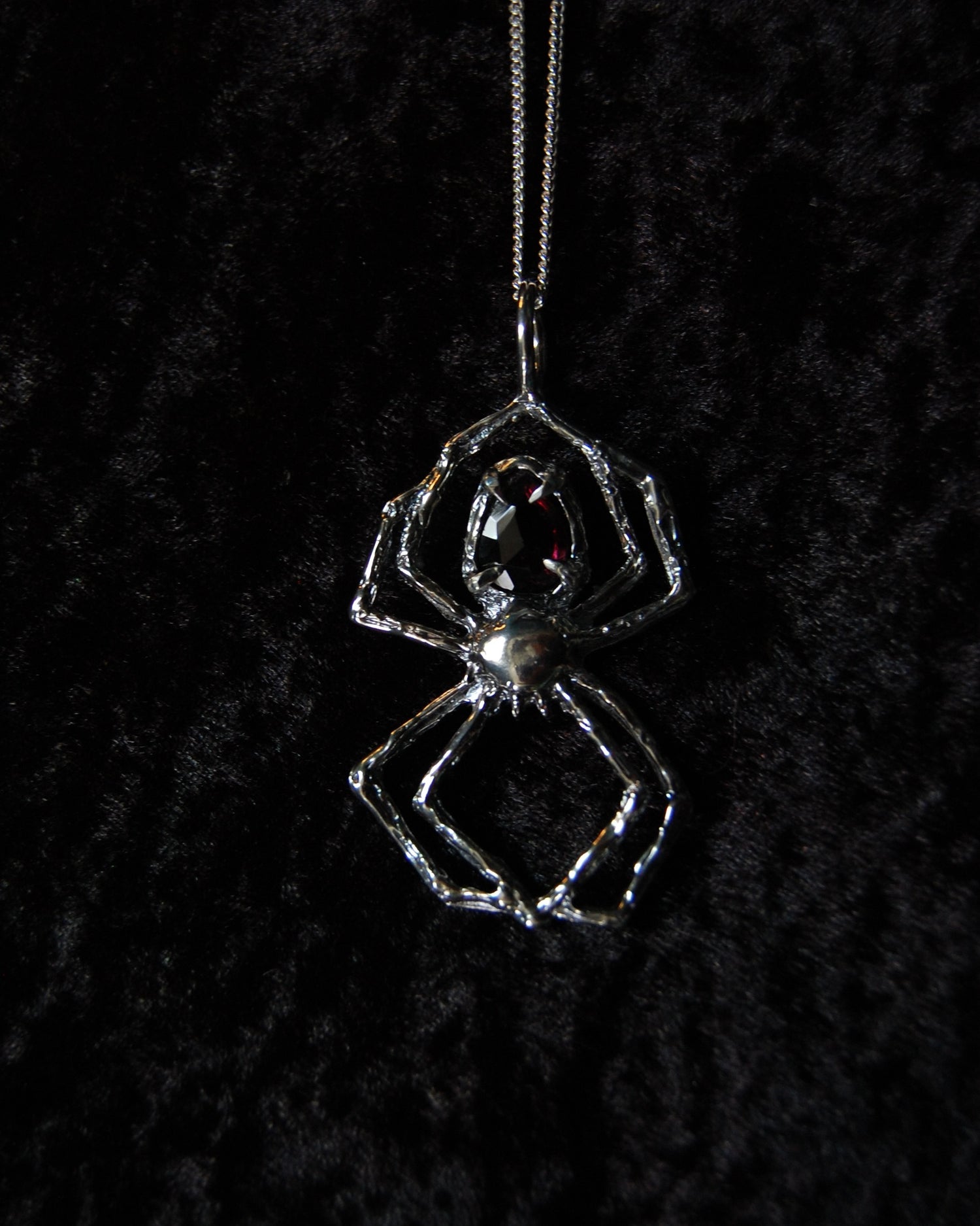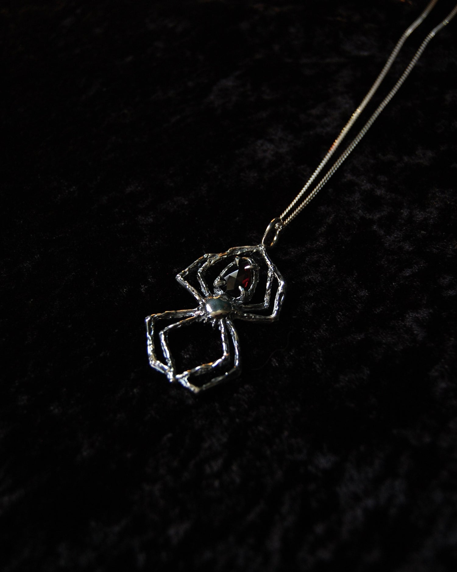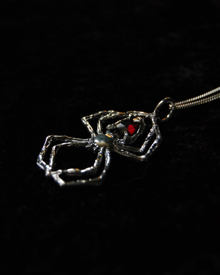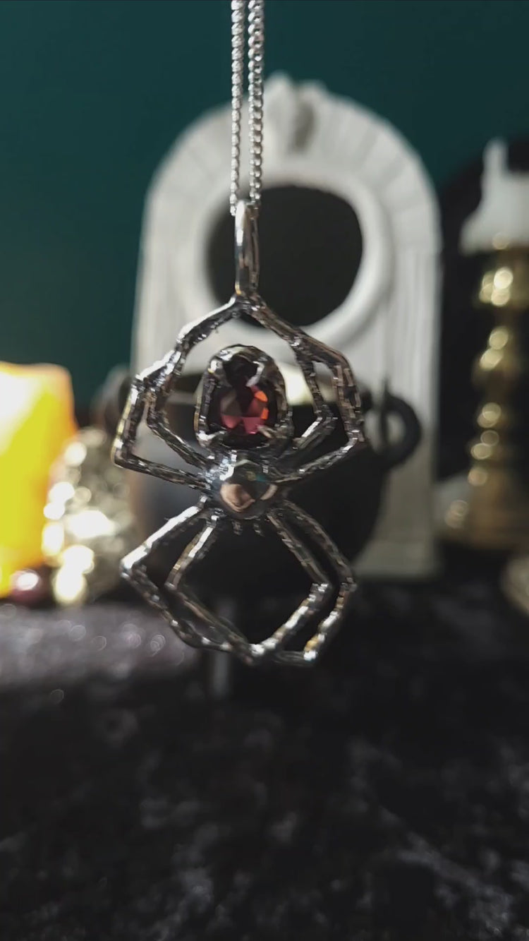Inspired by the spider’s intricate and tenacious weaving and the deep allure of garnet, this necklace is a testament to the power of resilience, transformation, and passion. Featuring a striking rhodolite garnet gemstone, this necklace captivates with its rich, fiery red hues. Known for its vibrant energy, garnet symbolizes passion, courage, and vitality, embodying the dynamic spirit of the spider.